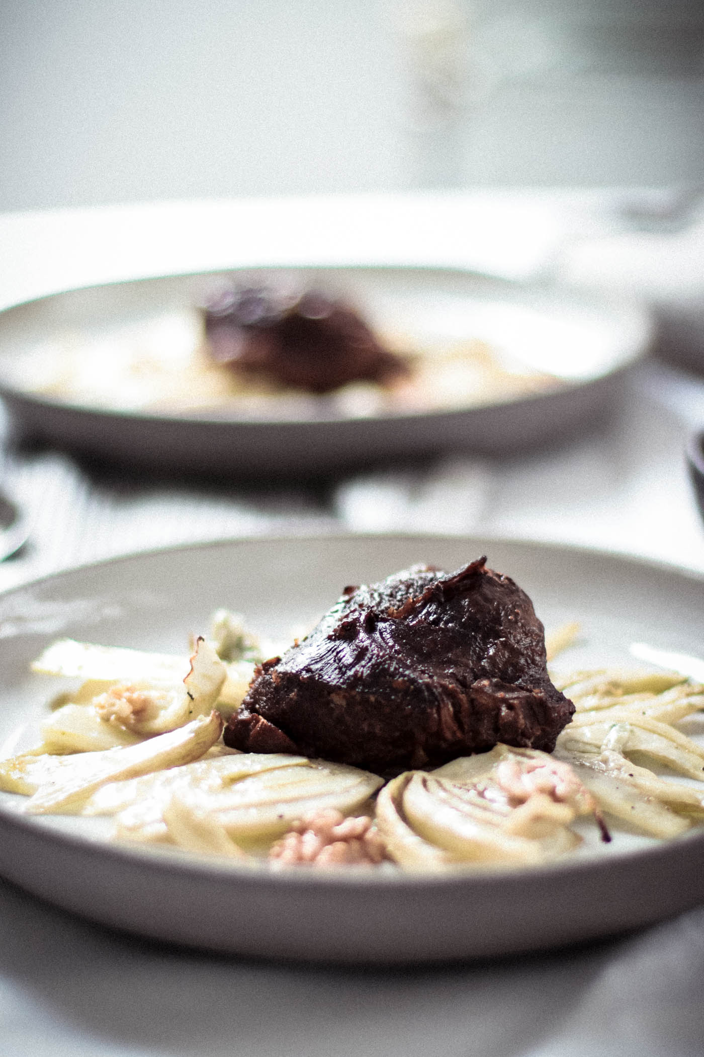I’ve always been a person shying away from preparing meat for guests as I just don’t like to cook it and always find it difficult to just get it right. But these braised veal cheeks are utterly simple to make and so, so tasteful. And accompanied by baked fennel with gorgonzola cheese as a side dish, this meal really is a special treat.