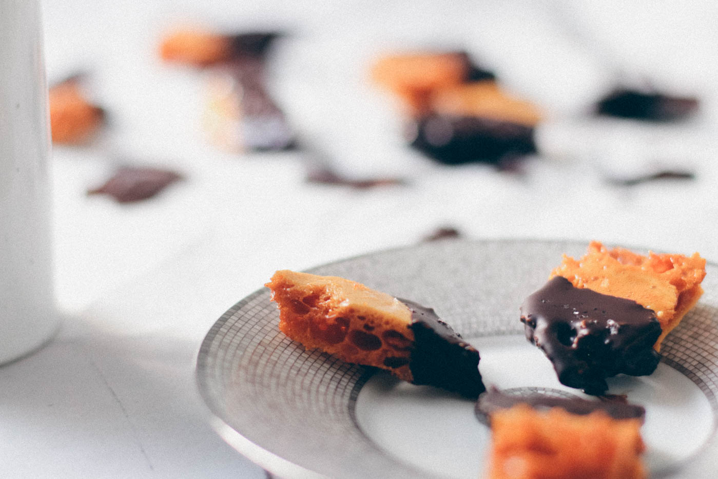 These honeycomb chunks dipped in dark chocolate and sprinkled with sea salt are the perfect treat for a busy afternoon. They are even better when dunked in coffee.